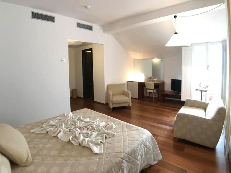 Hotellet tilbyder både værelser og suiter. Suiterne har en hyggelig, separat opholdsdel og giver lidt ekstra plads og komfort – perfekt til par, der gerne vil forkæle sig selv lidt ekstra. Her finder du desuden spabad samt badekåber og hjemmesko, som fuldender følelsen af et afslappende ophold.